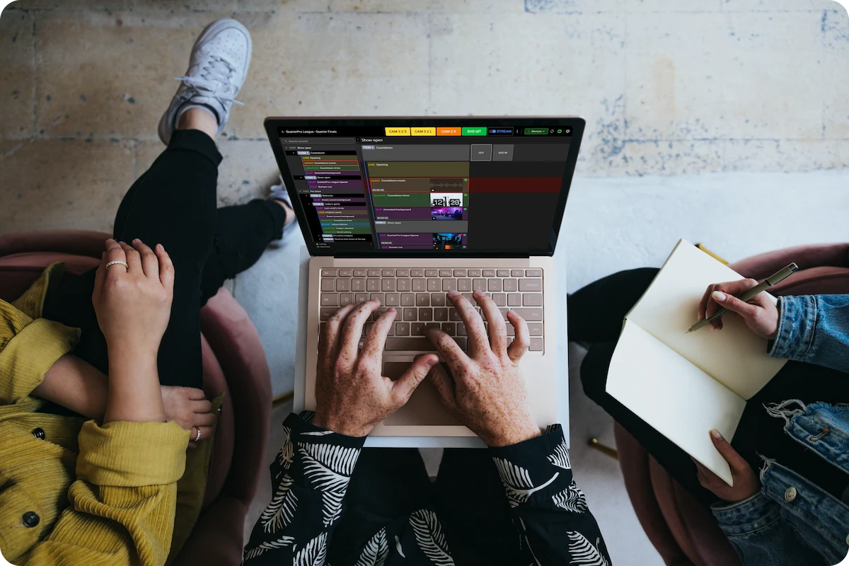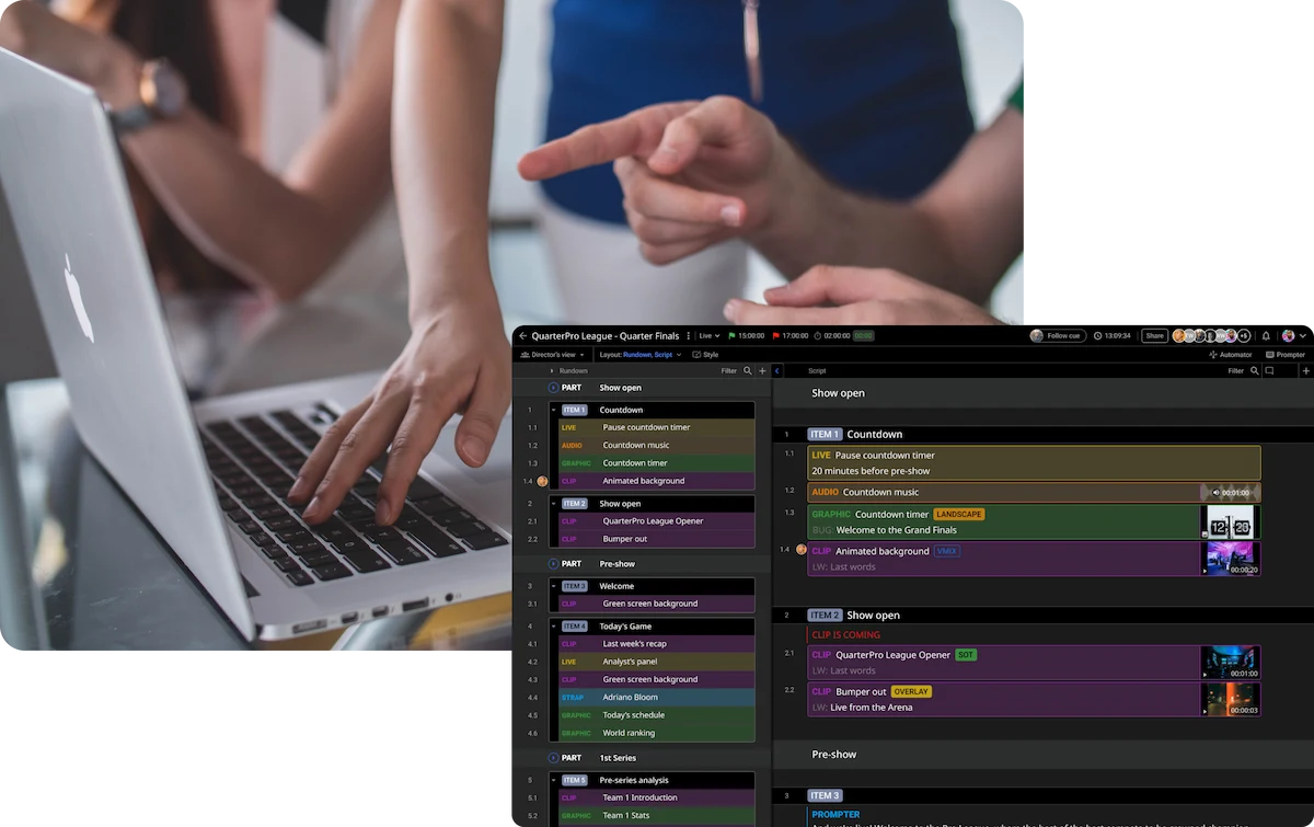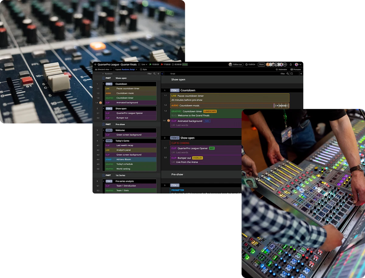 - Working in sync with popular integrations: vMix, NewBlue, TriCaster, CasparCG, OBS, Viz Flowics, Vizrt, SingularLive, Blackmagic…
