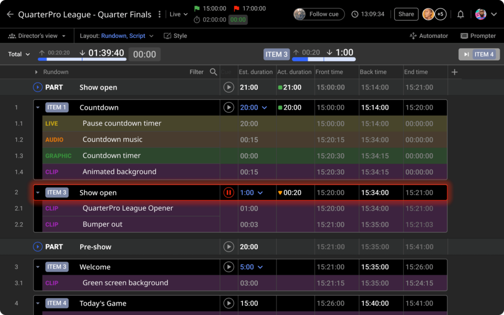 Cueing and timing columns will help you keep track of the timing of each shot or segment in your production. That includes planned time, actual timings, back and front time, and, what’s more, freezing, floating items, and many other amazing features. You can inspect and correct over and under runs live. The “follow the lead-Cuer” function ensures the entire team stays on the same page, hands-free.